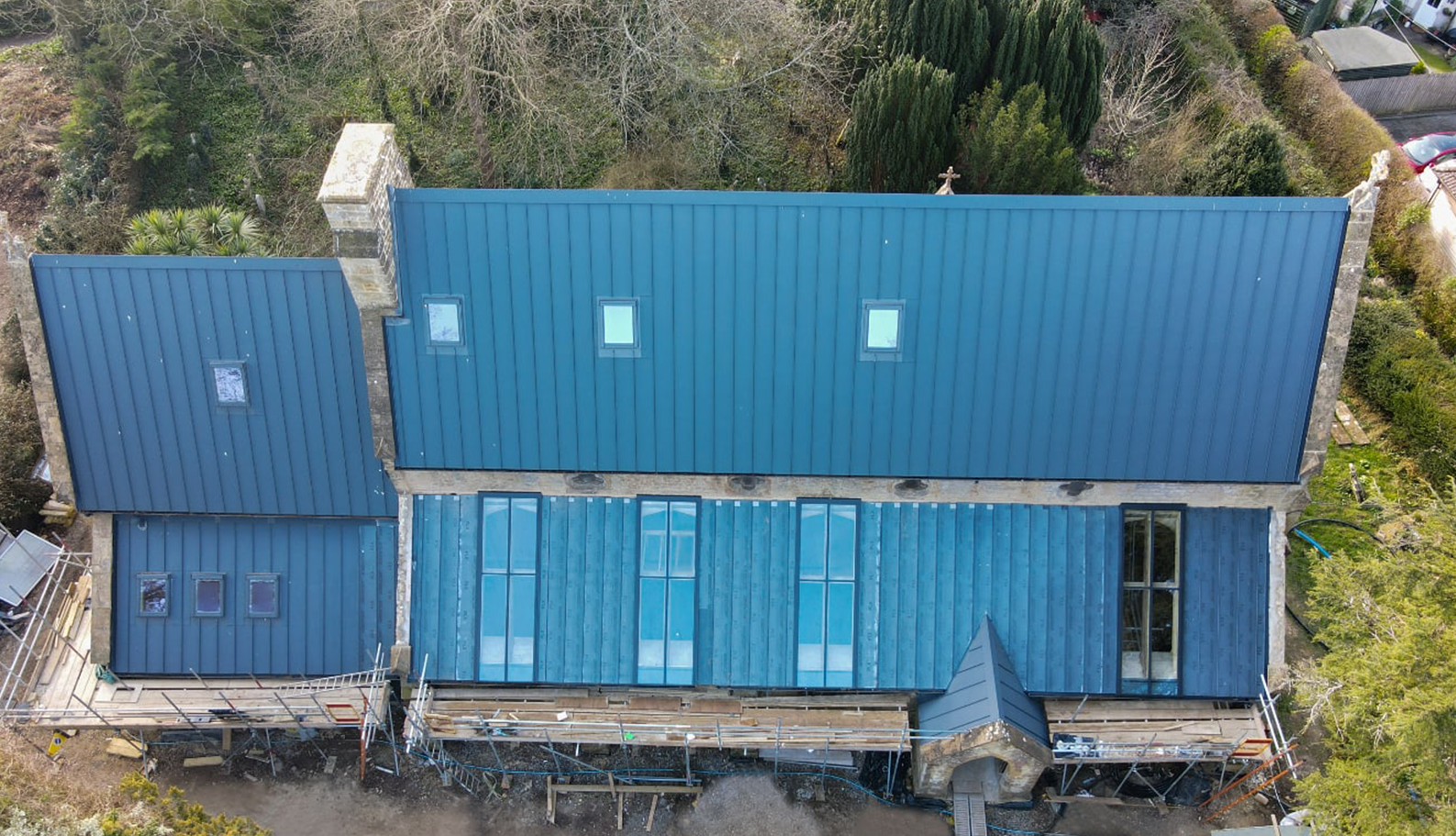 Externally the building has had a light touch repair to the masonry and new windows have been inserted in to the historic openings where the originals had already been removed. Most significantly however was the replacement of the slate roof with a new hard metal Greencoat roof, along with slimline self adhered solar PV panels. Not only will this covering last for well over another century, it will also provide power to the entire building, with some left over to go back to the grid each year.